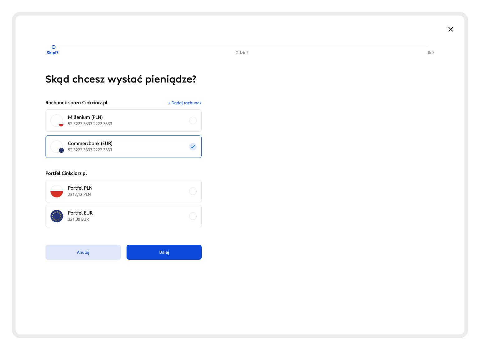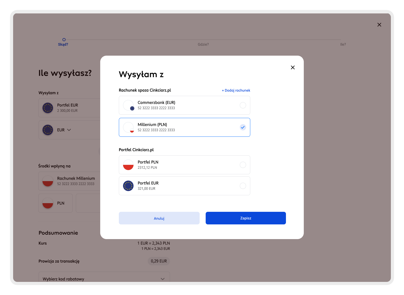 Transaction flow is the most important part of the product. This is where users add funds, exchange currency, and send on.